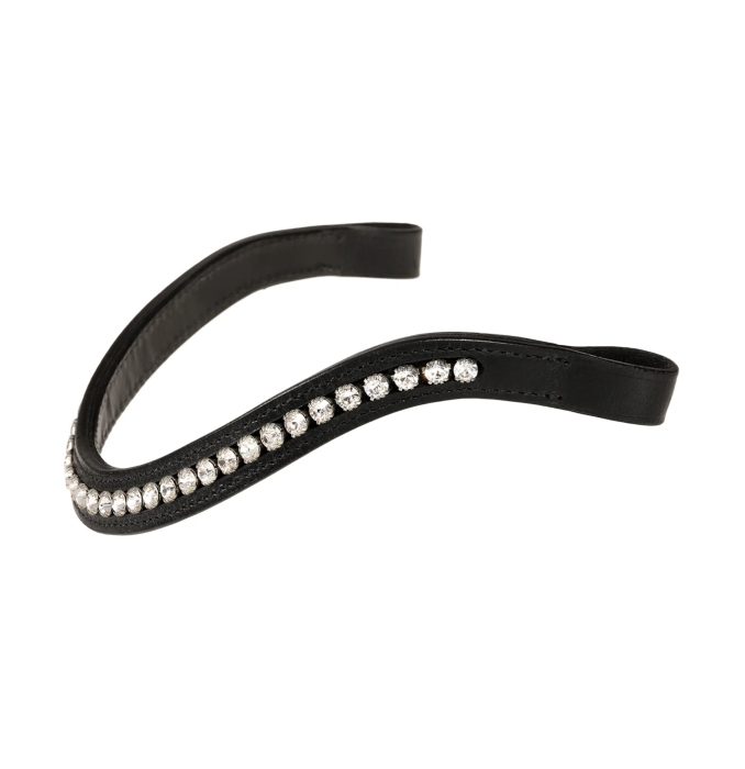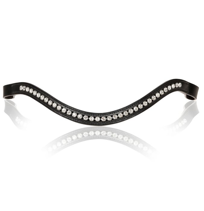 Curved bling Swarovski browband in black with clear crystals. This browband adds refined bling to any bridle. Flexible fit for maximum comfort and handcrafted from Austrian stellux crystals.