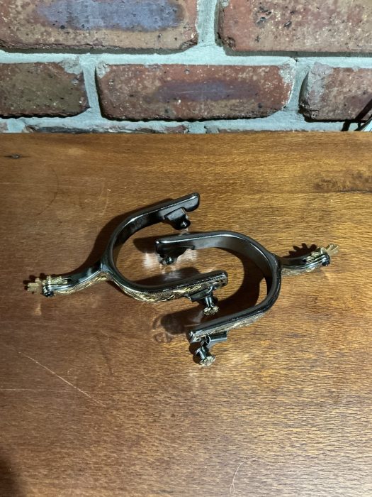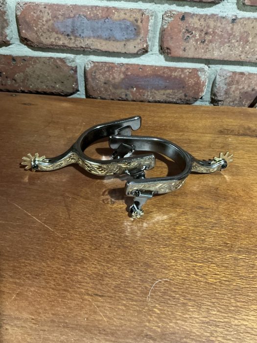 Campdraft spurs with engraved gold colour trim, polished steel 3/4″ band, 2″ shank and 1″ 10 point brass rowel and swing buttons.